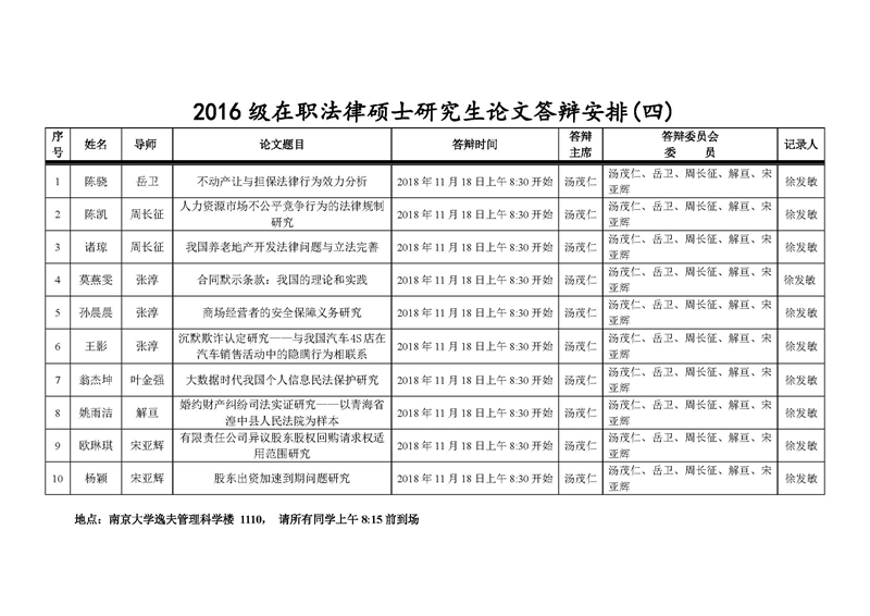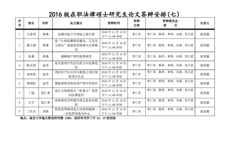 2016级在职法律硕士研究生论文答辩安排