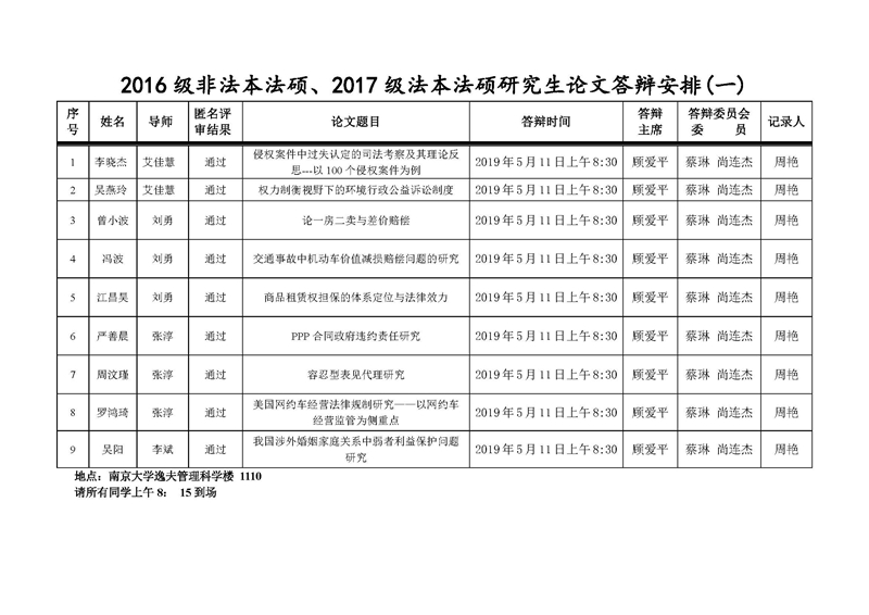 2016级非法本法硕、2017级法本法硕研究生论文答辩安排