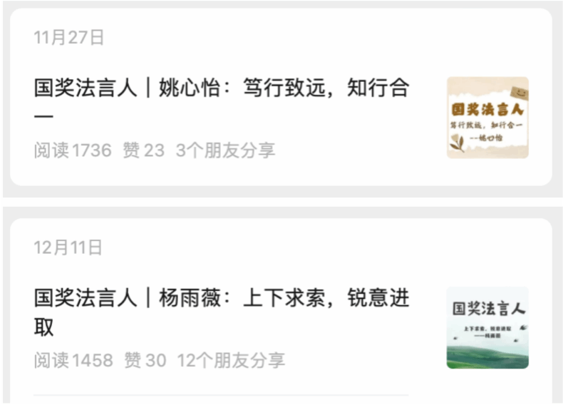 国奖法言人访谈第二期在12月上旬如期而至,在郑尹妮学姐的指导下,曹上同学采访了杨雨薇学姐,李湉湉、刘峻麟同学完成了推文的撰写。通过他们的推文,研一的新同学充分了解到杨雨薇学姐的优异的学习成绩,严谨的实习生活,多彩的文娱活动。三人行,必有我师焉。国奖法言人活动助力新同学学习宝贵经验,汲取前行力量。