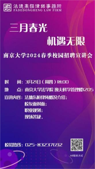 积极整合社会资源,于2024年4月24日在鼓楼校区逸夫管理科学楼20楼报告厅举办了“梦想启程,职等你来”2024年春季专场招聘会。11家省内优质律所和知名企业参加,新澳彩开奖
