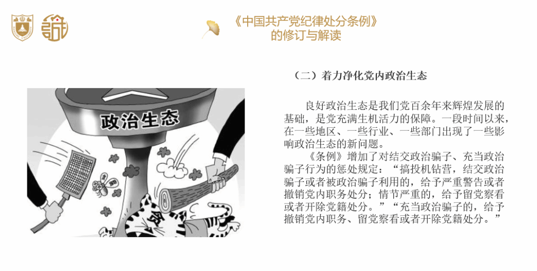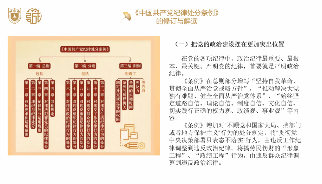 本次党日活动的第二部分由第一党支部书记路敏玥老师领学。路老师从对《中国共产党纪律处分条例》的修订与解读出发,通过对比具体条文,重点强调党中央持之以恒推进全面从严治党的决心,帮助同学们更深入理解其核心要义。