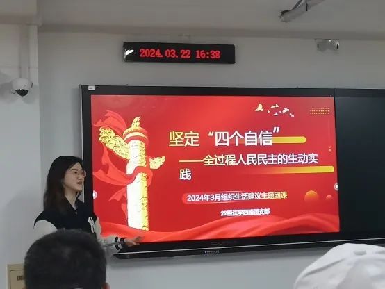 随后,同学们移步教室,团支书正式开始讲解主题团课,从理论和实践两个层面讲述了什么是坚定“四个自信”,为什么以及怎么做好才能坚定好“四个自信”。