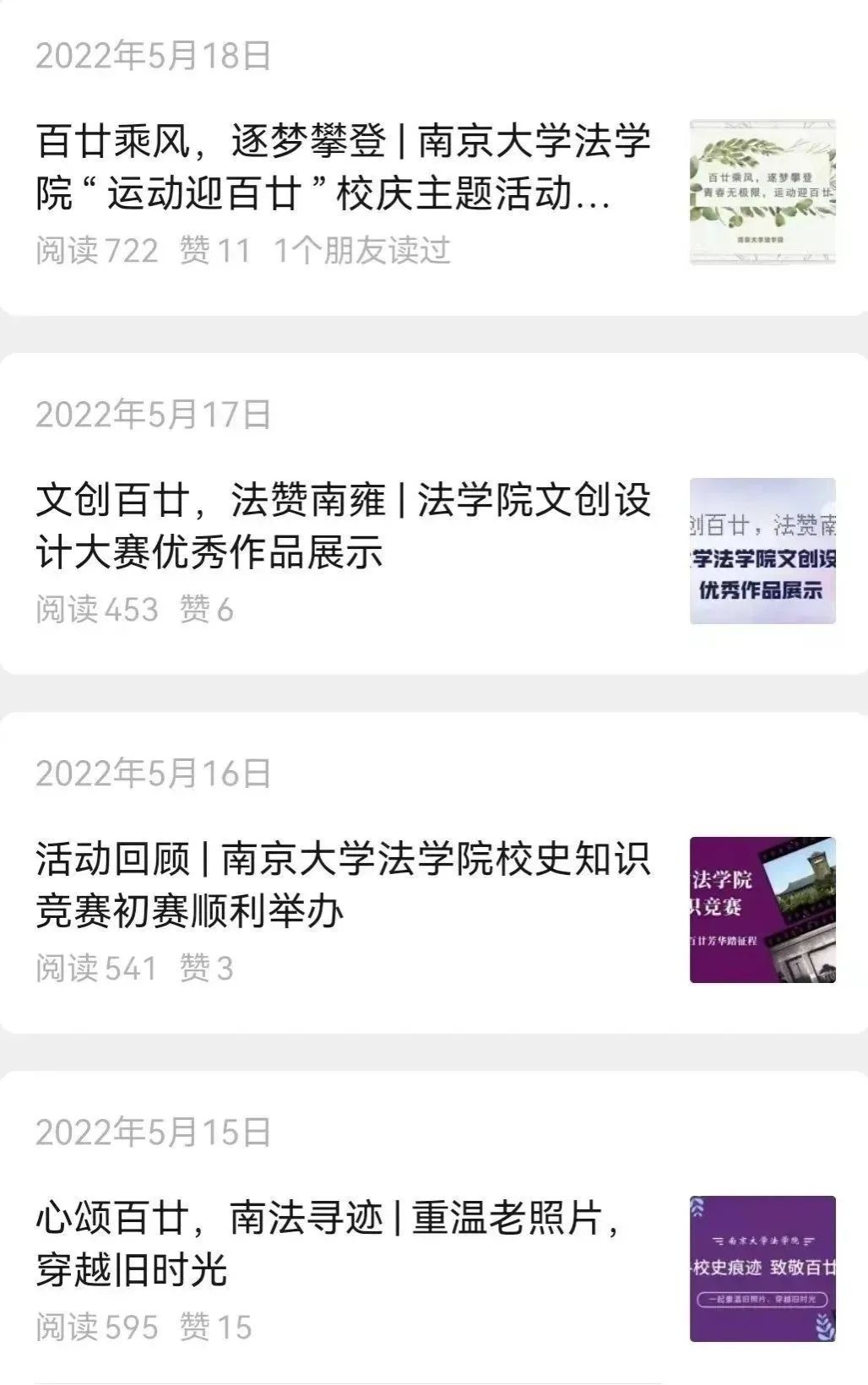 高度重视融媒体、全平台宣传工作,合并研会两大公众号,以“NJU法学研会”作为对外宣传的唯一平台,关注人数超5000人。围绕思想强基、时事聚焦发布推文近百篇,其中“我与南大的故事”图文征集活动阅读量近3600次,再创研会新高。