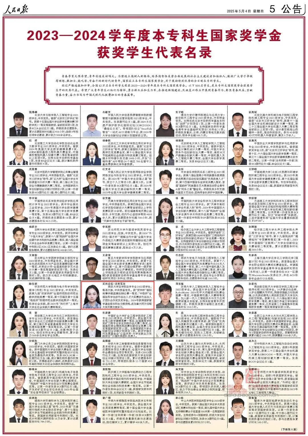 5月4日,《人民日报》(第05、06版)刊登《2023—2024学年度本专科生国家奖学金获奖学生代表名录》,新澳彩开奖 买热合巴·艾尼瓦尔同学入选名录。