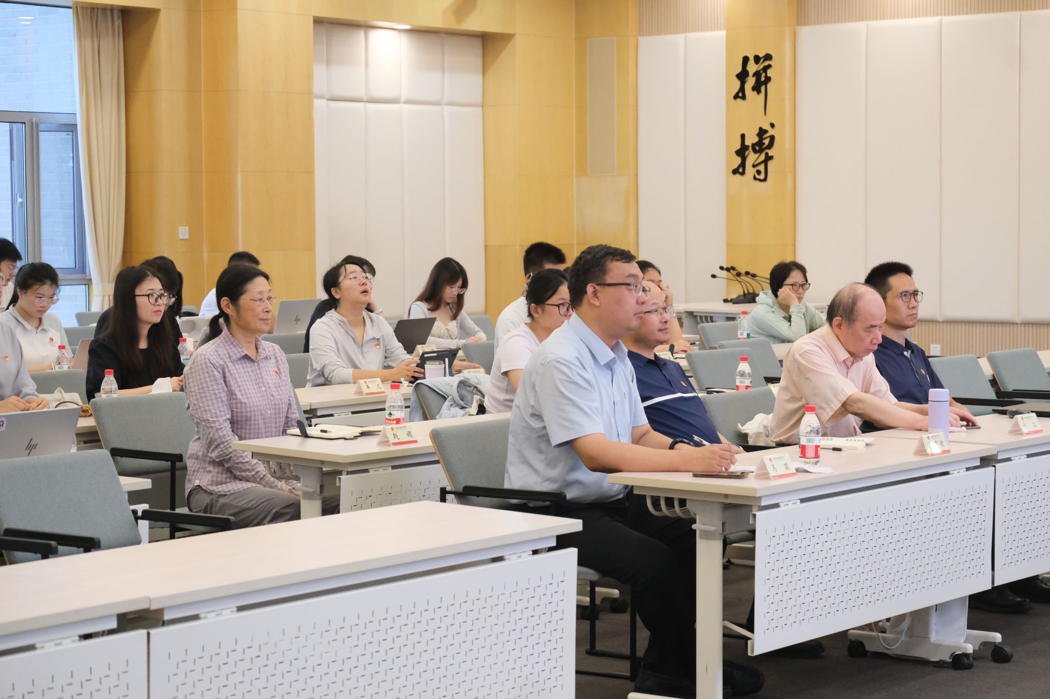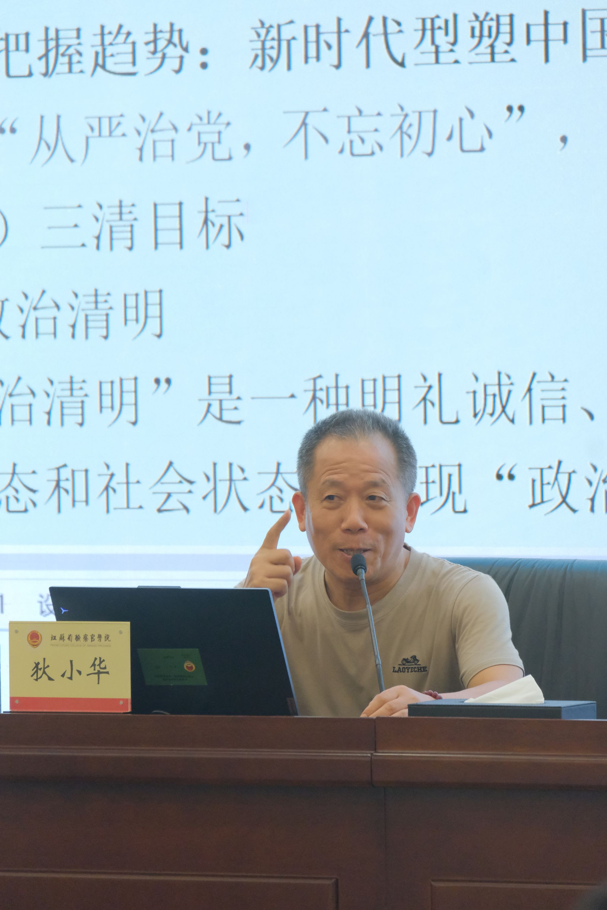 教授狄小华为师生学员作“新时代反腐倡廉新模式”专题授课。“腐败是危害党的生命力和战斗力的最大毒瘤,反腐败斗争必须常抓不懈、久久为功。”讲座中,狄小华围绕习近平总书记关于党风廉政建设和反腐败斗争的重要论述,结合党的二十大报告中对全面从严治党的新要求,深刻且系统地解答了在新时代的全新挑战下,党员同志应如何精准回应人民群众的期待,切实彰显新作为。学员们专注聆听、潜心思考,认真领悟全面从严治党的战略方针,对“全面从严治党永远在路上”的内涵有了更深刻的理解。