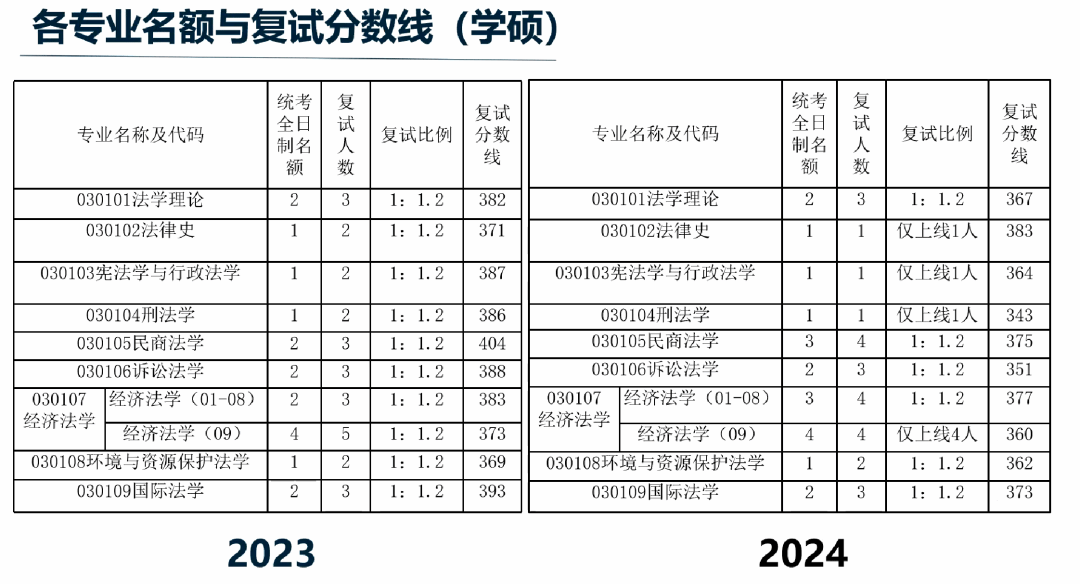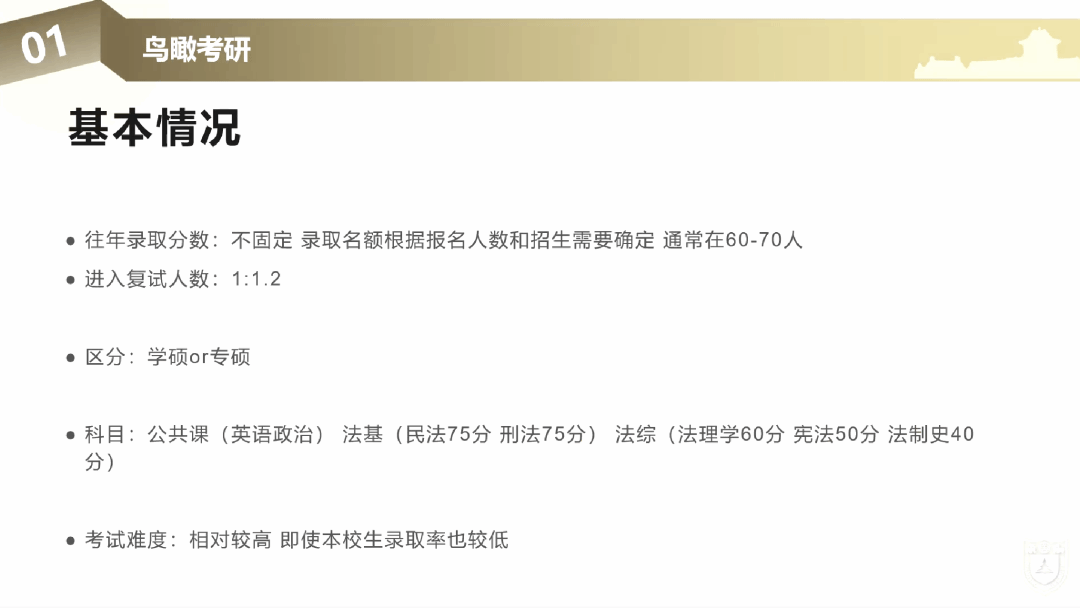 吴玉玺学长同时介绍了南京大学统考全日制的学硕名额,复试比例和复试的分数线,总结出各专业往年的统招情况的基本特点。根据统招特点,法学学硕的专业主要可以分成三类,分别是民商法,经济法,国际法等容错率较高的专业;法律史、宪行、刑法、环资等容错率较低的专业;法理学、诉讼法、中德所等容错率尚可的一类,并建议大家根据自身情况选择适当的报考专业。