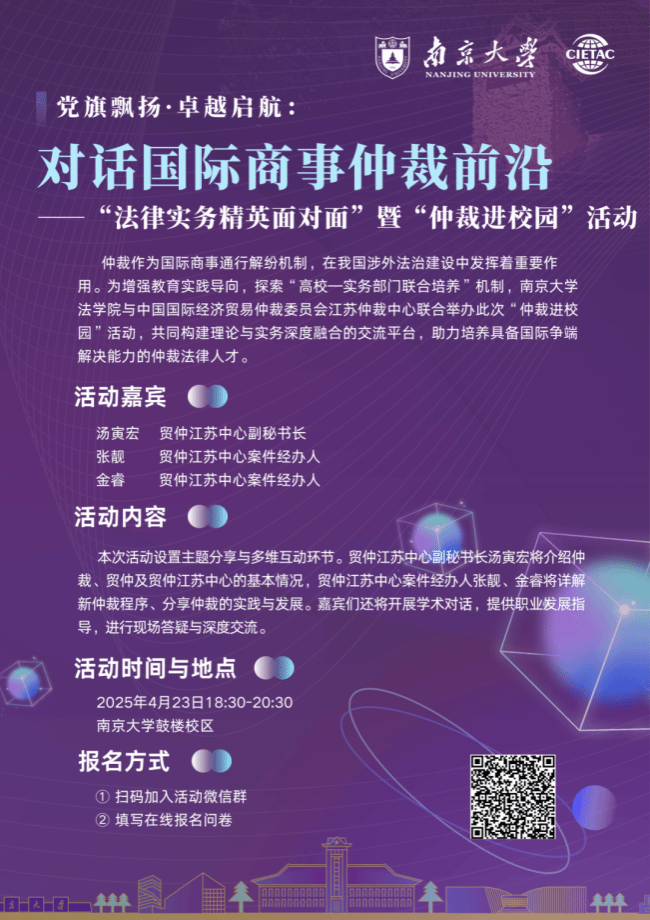 与中国国际经济贸易仲裁委员会江苏仲裁中心(以下简称“贸仲江苏中心”)联合举办此次“法律实务精英面对面”暨“仲裁进校园”活动。本次活动将邀请具有丰富仲裁实务经验的贸仲江苏中心副秘书长和案件经办人,围绕贸仲及贸仲江苏中心情况、仲裁实践与发展等主题进行分享,为同学们搭建近距离接触商事仲裁法律人才的平台。该活动旨在“产教融合,协同育人”,探索高校与仲裁行业“联动培养”机制,帮助同学们在实践中了解商事仲裁法律实务与商事仲裁机构设置,助力同学们投入商事仲裁法律实践。
