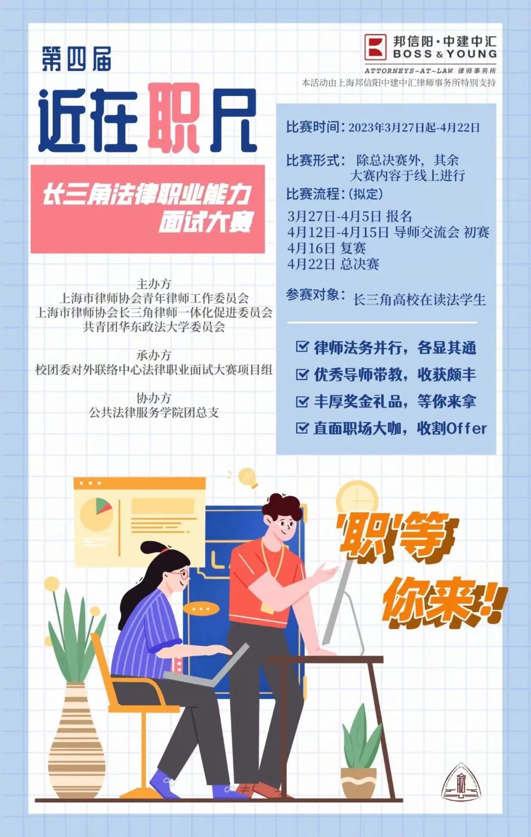第四届“近在‘职’尺” 长三角法律职业能力面试大赛现面向长三角地区所有拟在法律行业求职的高校在读学子发出邀请!offer大礼包已备齐,各路神仙导师已就位,你,准备好了吗?