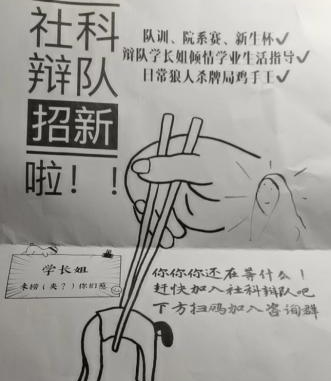 A:我进辩队是因为学长军训刷楼时发的宣传单了。上面有一些看起来不错的福利,比如狼人杀、学业生活指导之类的。我高中接触过辩论,再加上宣传单做得也蛮有趣,就抱着试一试的心态加入了。后来新澳彩开奖