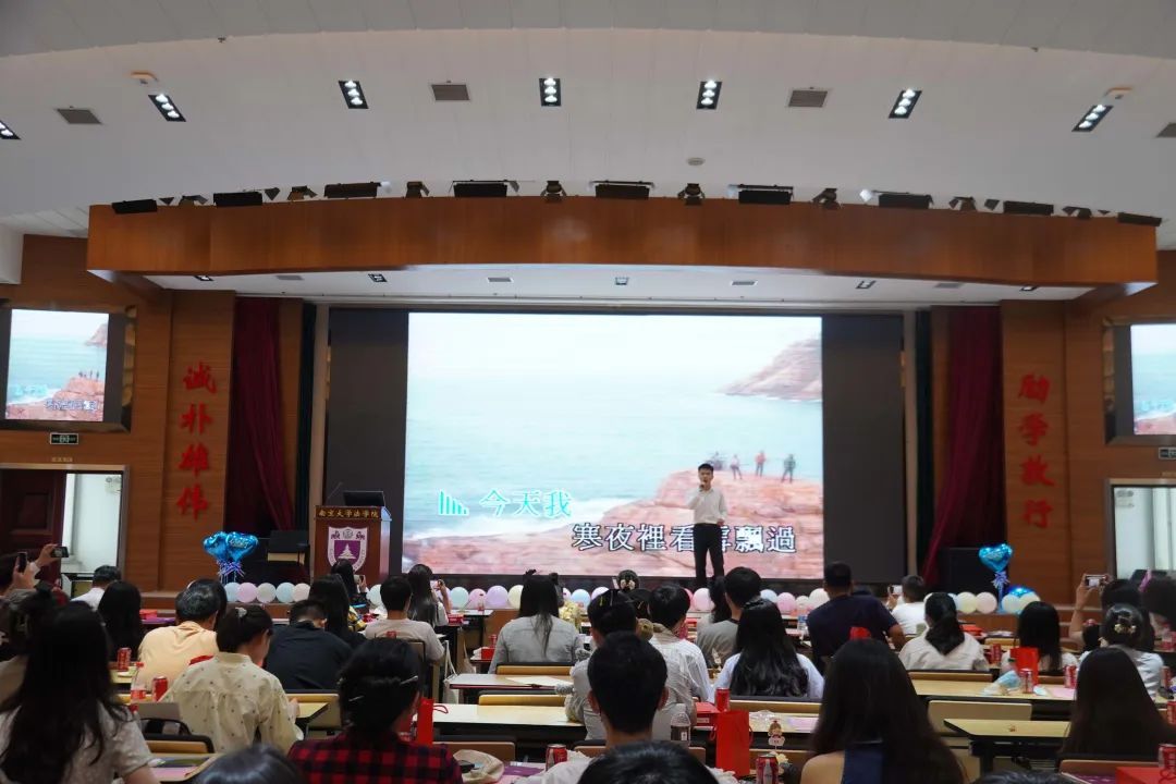 随后,20级法律硕士(非法学)宫通宇同学为大家献唱《海阔天空》,在全场大合唱、气氛一度走向热烈。希望全体同学都可以迎着冷眼与嘲笑,背上理想、走向远方!
