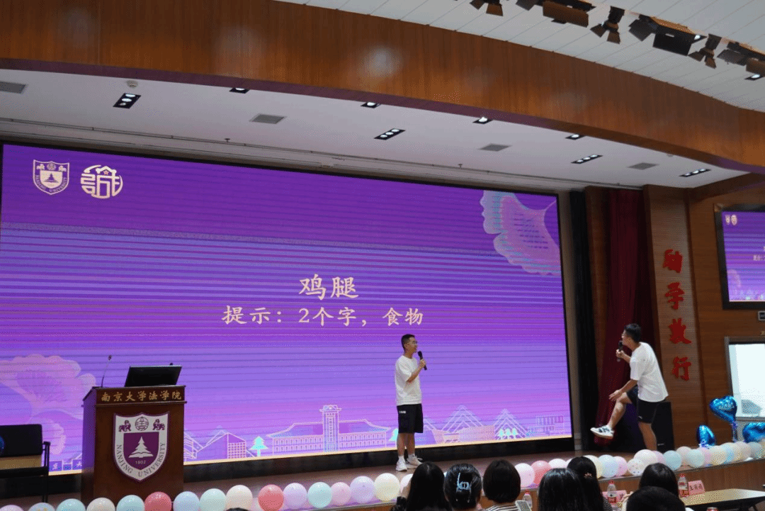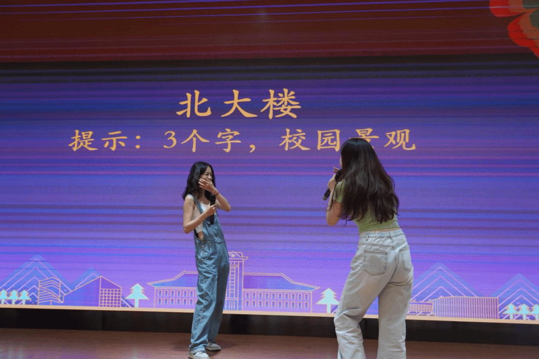 为了将这份美妙延续,我们来到了本次班会的第一次互动游戏环节。“你画我猜”游戏不仅考验着同学们的默契,同时也显示出同学们渊博的知识素养和比拟的艺术能力。在有限的三分钟时间内,根据大屏幕上的指示词,一人做动作,一人猜词语,猜对数多者胜出。两组同学都使出浑身解数,逗得在场同学捧腹大笑,在这过程中,场内气氛再一次升温,这是全体南法人的专属默契。