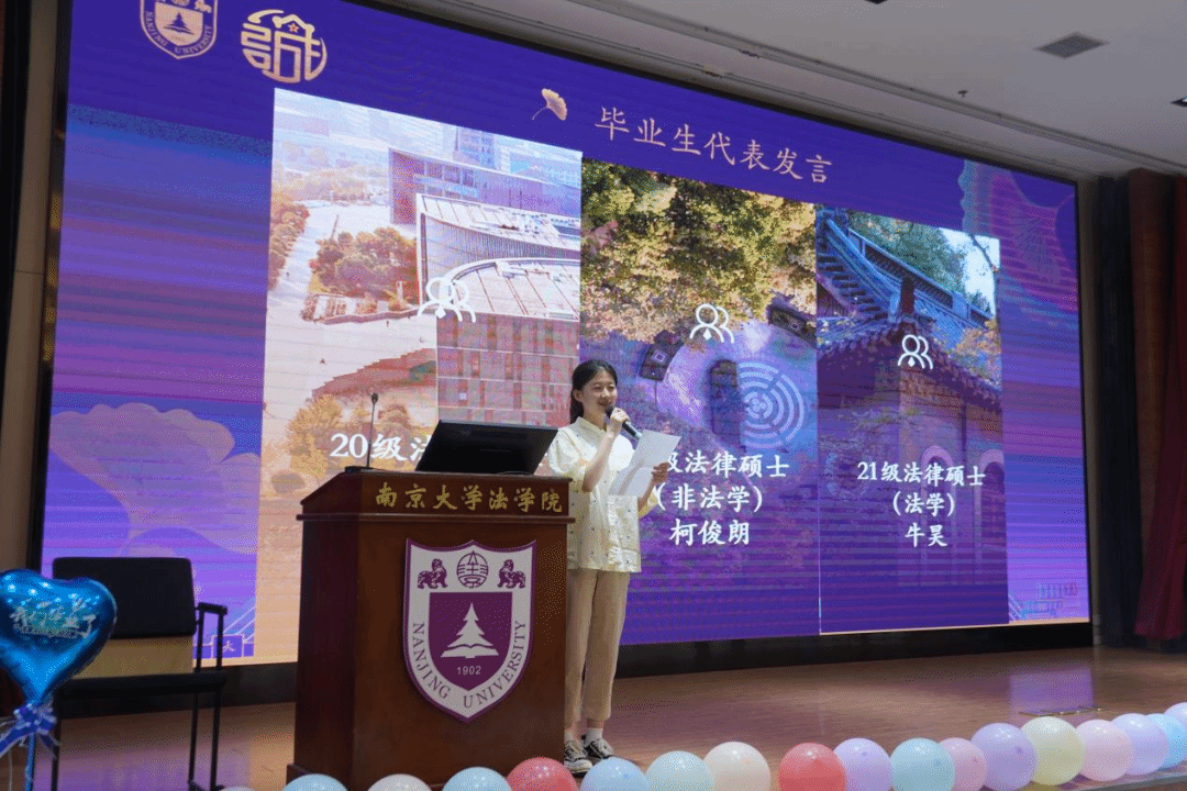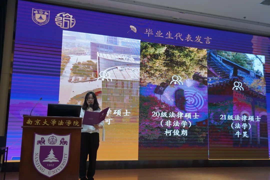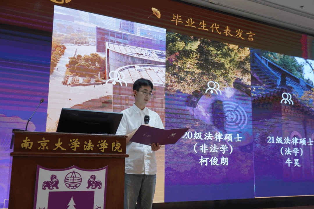 随后,20级法学硕士许可、21级法律硕士(法学)牛昊、20级法律硕士(非法学)柯俊朗先后作为毕业生代表上台发言。他们与各位同学们一起回顾了两三年校园生活的点点滴滴,鼓励每位同学在新的人生阶段始终坚持诚朴勇毅、自强不息,真诚待人、诚心做事,不断作出新的贡献。
