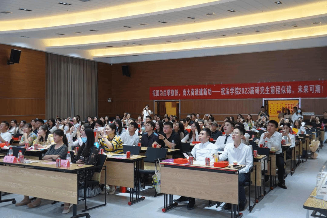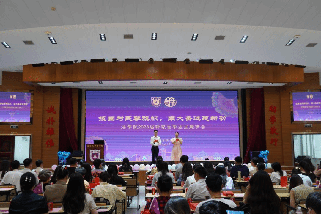 在逸夫管理科学楼20楼报告厅举办了以“报国为民擎旗帜,南大奋进建新功”为主题的研究生毕业班会,再看一眼师友、再道一声珍重,一起镌刻南大时光,一同祝福母校奋进,一齐奔赴星河长明。依稀临别,唯有相惜,毕业生们与院领导、辅导员欢聚一堂,面面交谈,畅谈师生情谊与光明前方。