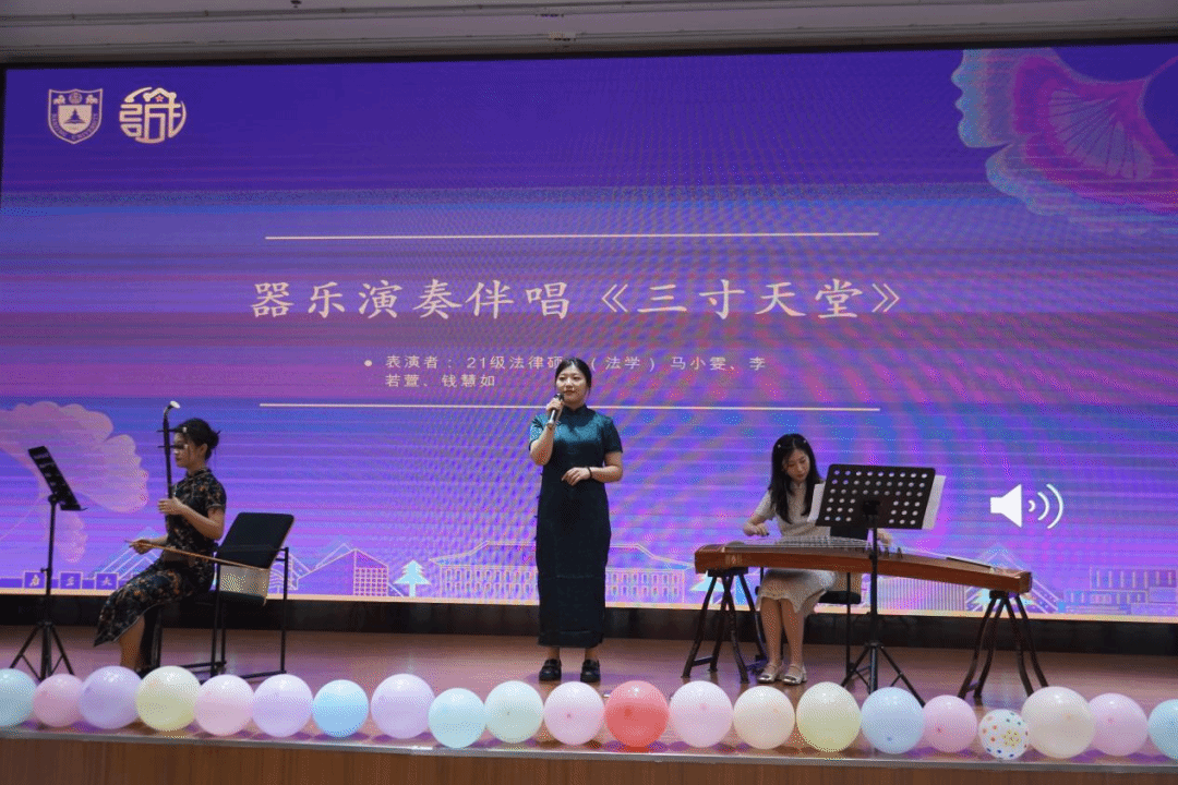 青葱岁月,点点滴滴。随后,2021级法律(法学)硕士马小雯、李若萱、徐思佳、钱慧如同学为大家带来器乐演奏伴唱《三寸天堂》,这首歌不仅承载着同学的回忆,也折射出分别之际的恋恋不舍。