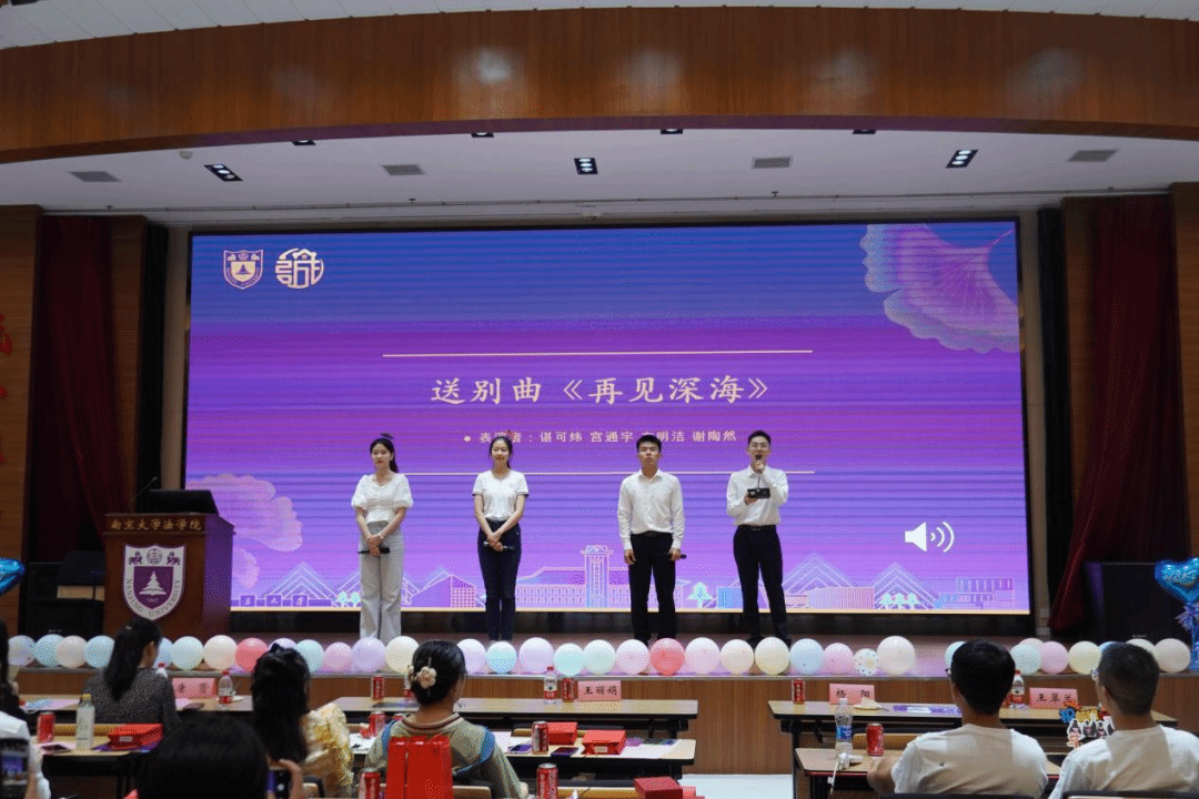 最后,20级法律硕士(非法学)谌可炜、方明洁、宫通宇同学为大家献唱《再见深海》。学海无涯,顶峰相见,再见深海,深海再见!毕业班会就此来到尾声,同学们的人生篇章也将翻入新的一幕。