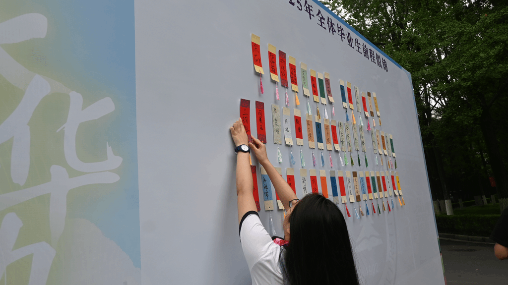现场最热闹的是两处“青春据点”:一处是铺满书签的签名墙,毕业生们依次上前签下名字;另一处是趣味打卡KT板,大家在此处摆pose、展笑颜,快门声此起彼伏。毕业生们共同把这一方天地,变成了西南楼最鲜活的“青春存档点”。