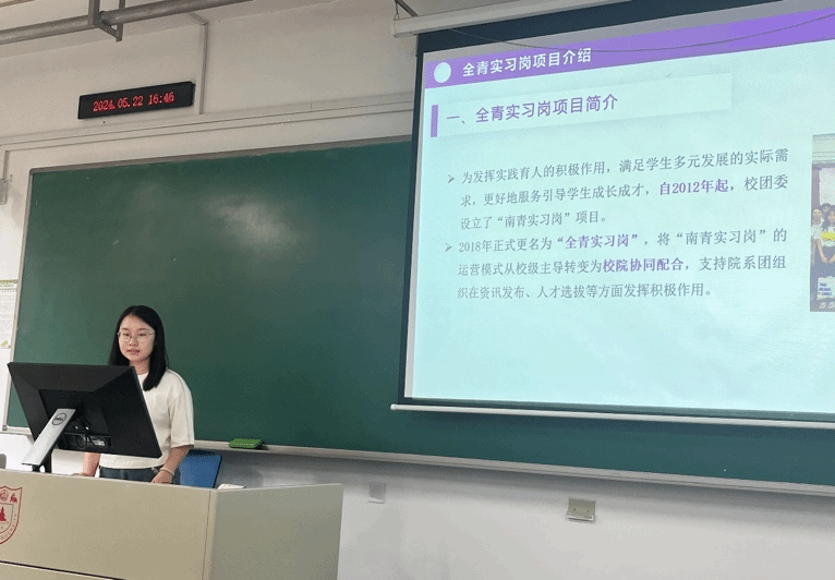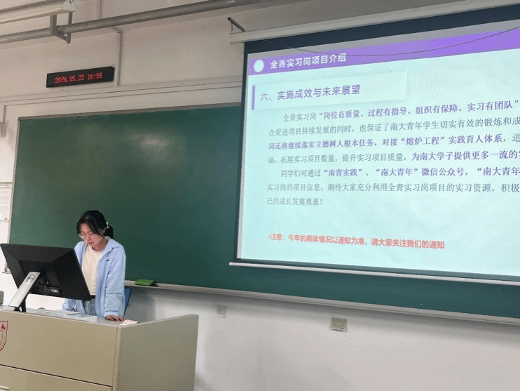 随后,聂稼轩同学详细介绍了全青实习岗项目的整体情况,并特别强调了2023年度该项目的实施进展。回顾历程,本年度,项目成功选送了153人次前往六个省份及直辖市的十一个区域进行实习实践,展示了其广泛的覆盖面和深远的影响力。全青实习岗项目始终坚守“四有”设岗要求,即“岗位有质量、过程有指导、组织有保障、实习有团队”,这不仅确保了项目的持续发展,更为南京大学青年学生提供了锻炼和成长机会。展望未来,她表示,全青实习岗将继续秉承立德树人的根本任务,与“熔炉工程”实践育人体系紧密对接,拓展实习项目数量,提升实习项目质量,致力于为南大学子提供更一流的实习实践机会。