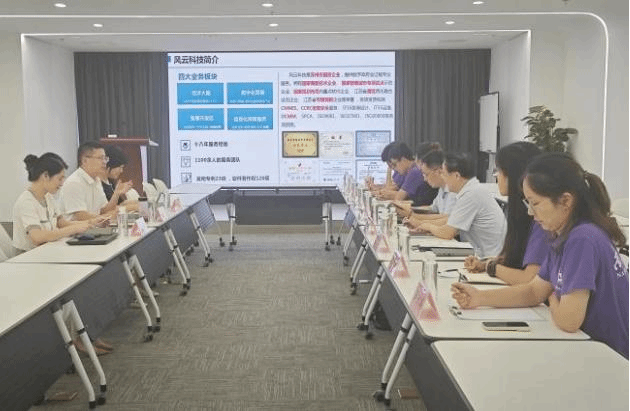 此外,7月30日,团队成员参与江苏省数字经济学会的企业调研活动,来到江苏风云科技有限公司,了解政务信息化和智慧城市的运作。其中,公司的创新应用“政策计算器”让同学们非常感兴趣,它基于强大的数据资源,叠加大数据+AI技术,“变企业找政策为政策找企业”,为企业智能计算政策匹配度并预测政策效果,在政府和企业之间发挥了重要作用。