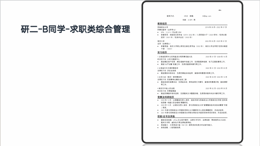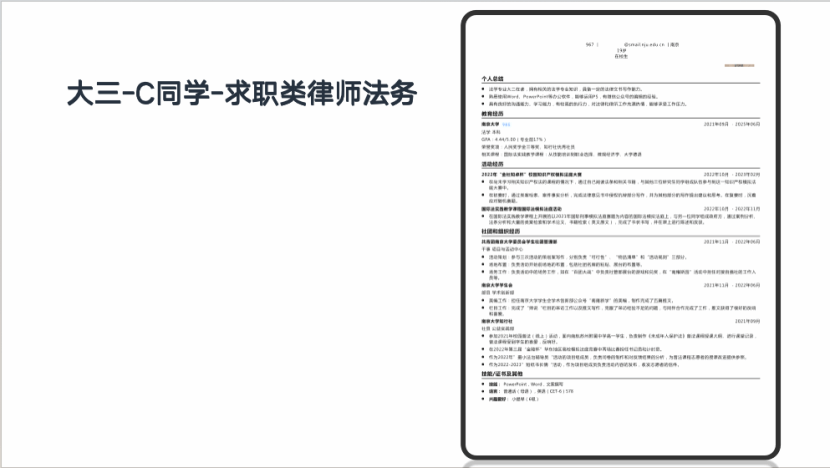 律所和国企所关注的重点不同,律所相对而言更看重实习经历,而国企更看重政治面貌、学生工作;同时,应根据岗位的具体业务方向,选择与业务方向相关、符合用人单位需求的实习经历呈现在简历上。