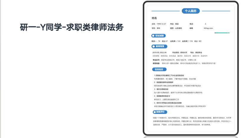 在点评、分析的过程中,李润卿学长根据简历的不同类型提出了一些要点,包括:求职类简历应明确毕业年份,律师法务岗简历应突出教育背景和实习经历,综合管理岗应突出政治面貌等等。