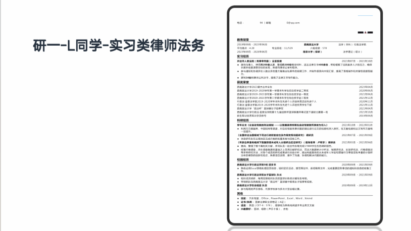在遣词造句和排版布局等细节上,李润卿学长提醒大家:第一,尽量使用“协助”“参与”“跟进”等动词介绍工作经历,不要过度夸大,保持一定程度的谦虚;第二,实习生≠实习律师,拿到毕业证书才能是实习律师,在校生只能是实习生;第三,注重减少空隙和不必要的缩进;第四,发送电子邮件时,务必确保简历是PDF格式。