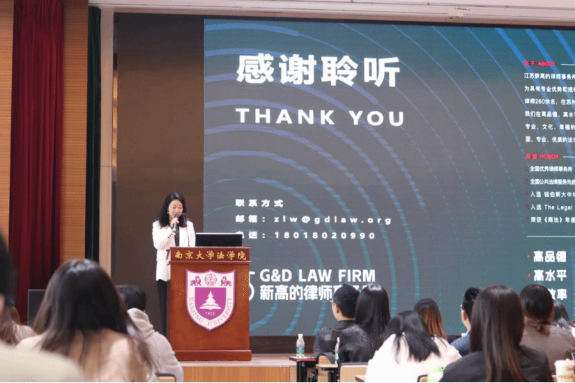 江苏新高的律师事务所合伙人律师郑沥为与王宇微分别从律所概况、青年律师培养计划与招聘计划两方面进行了宣传。一方面,郑律师对律所的发展历程、办公环境、所获荣誉、律所团队与专业化建设进行了介绍,并展示了律所对文化建设的重视与曾举办的多种活动。另一方面,王律师重点介绍了律所对青年律师的培养方案和升迁路径,并公布了招聘岗位和要求,鼓励广大同学积极投递简历。
