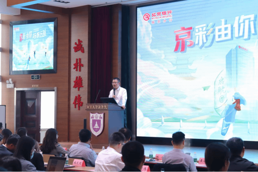 北京银行南京分行公司银行部总经理王非关注就业学生的需求,从北京银行南京分行整体背景规模、员工培养方案、待遇福利等方面进行了宣讲,如南京分行近年来扩大的招聘规模和涉及衣食住行多方面的福利待遇体系,之后对北京银行的启航实习方案进行了重点介绍,并欢迎各位同学投递简历。
