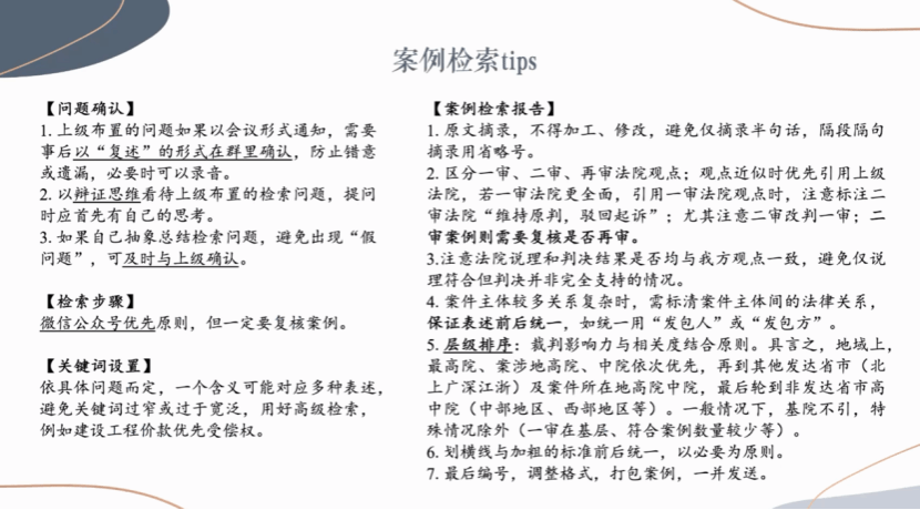 学长分享了在律所诉讼具体的实习内容以及案例检索的方法。按照案件的处理过程对实习内容进行了整体的梳理,从处理证据、制作证据册到草拟简单文书、校对各类文件,搜集财产线索和资信情况,对案件进行初步梳理,再按照案例检索的方法进行法律检索和参考案例册,电话咨询、打印整理起诉材料等……,并对案例检索的经验进行了详细的分享。