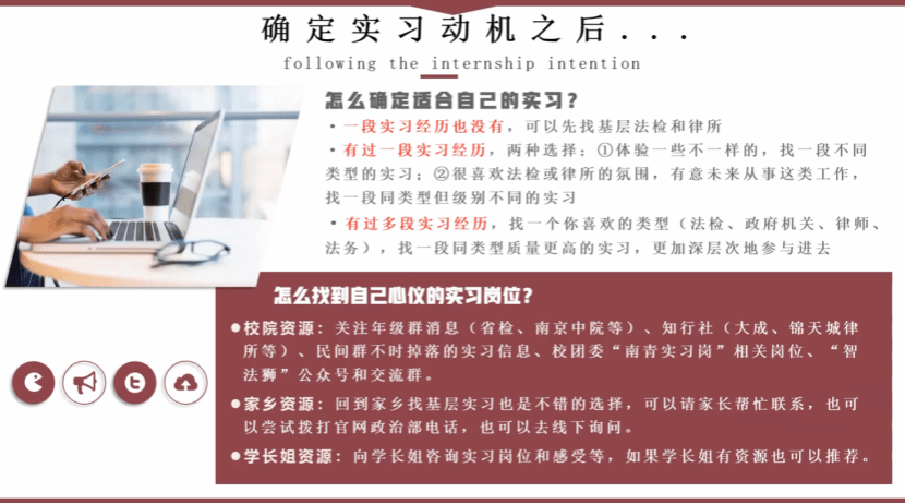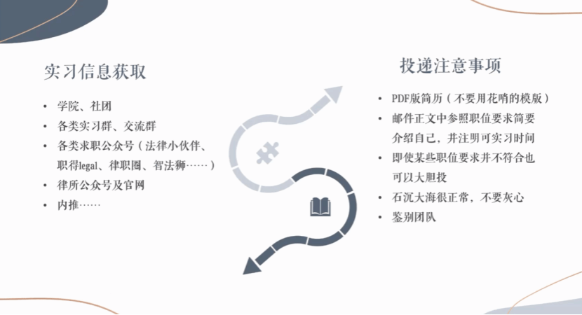 王宇佳学姐从实习渠道、法院检察院实习经历、实习感悟等角度为大家分享经验。