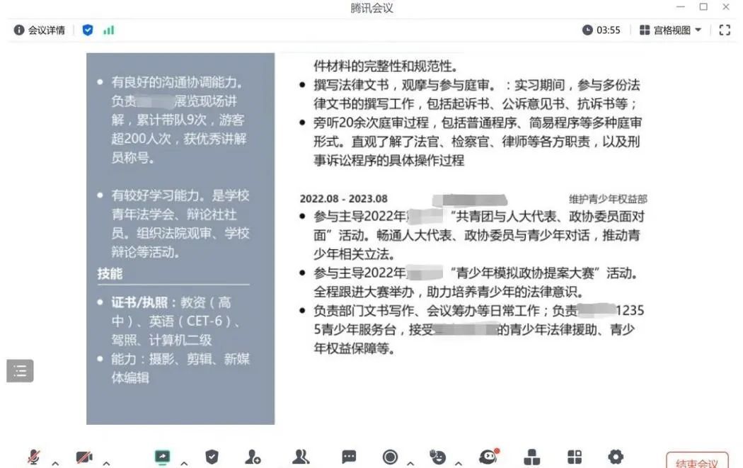 周文律师从同学们简历中的个性、共性问题出发,一对一就简历提出独到的见解:首先,在排版安排上,应保持简历的简洁性,避免冗长和无关的信息,并应将简历尽量控制在一页纸的范围内;其次,在个人技能板块,应突出个人优势,体现与求职岗位相关的专业能力,最后,在自我评价板块,应注意对个人的优势亮点进行总结和概括,并结合应聘岗位的要求、岗位所需的技能进行重点描述。