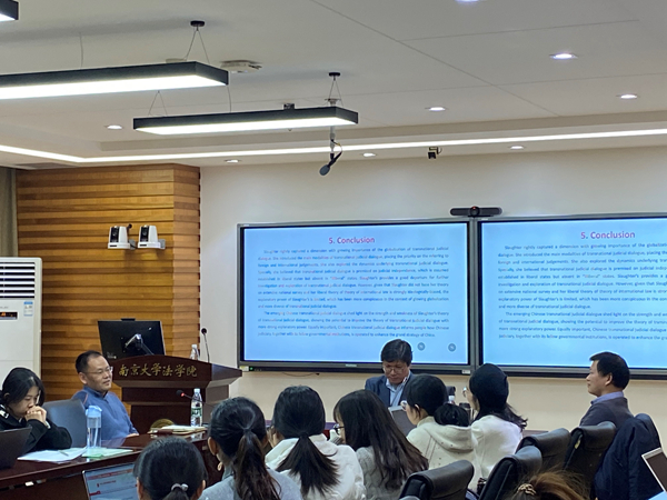 其后,彭岳教授对本次讲座进行了点评,指出“跨政府网络”理论的实践意义,可能会在不久的将来体现在南京海事法院“一带一路”建设当中。进一步指出,“跨政府对话”的中国思路,提供了一条将国家意志与规则上升到国际层面的途径,不仅是在法院层面,还有兼容监管、税收等国际经济法各方面,以更好体现民主意志的方式,将本国意志进行表达,从而在一定程度上实现认识的共同体。