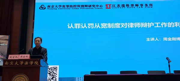 本环节第一位发言人江苏瑞格律师事务所主任周金刚博士以 “认罪认罚从宽制度对律师辩护工作的利弊影响”为题展开报告。周博士表示,随着认罪认罚从宽制度推向纵深,给律师辩护带来了前所未有的挑战和机遇。同时他认为,规则间的不统一与可辩护内容的不明确是律师辩护陷入困境的重要归因。针对刑辩律师如何应对认罪认罚从宽制度带来的不利影响,周博士提出了四点建议:一是在思想上领会,实现制度认同;二是在业务上下功夫,实现能力跟上;三是在协商上找突破,实现利益最大化;四是在与当事人沟通上多用心,实现案结事了和人和。