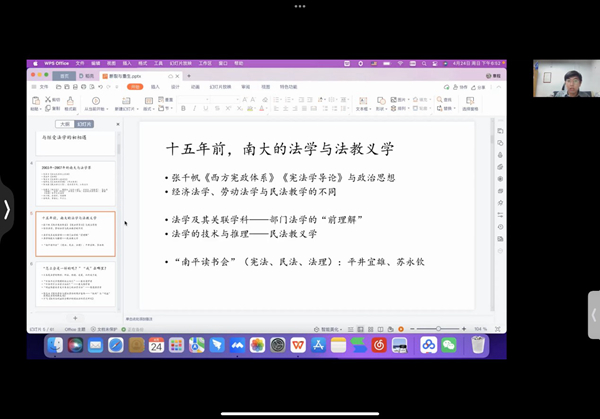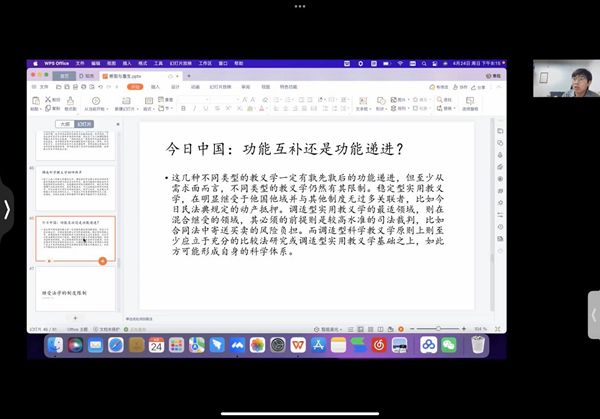 讲座伊始,解亘教授对于章程老师的学习和教学科研经历做了简要的介绍。章程老师表示,此次能够通过在线方式回到母校做报告,再次见到母校的师友,内心非常激动。讲座伊始,章程老师结合自己的求学经历,尤其是在南京大学的本科岁月,指出继受法的学习和研究在东亚法域的重要意味;而对于当下中国的民法学研究来说,要意识到不同国家和地区法学发展路径的差异,并通过理性的研究去不断地追寻“自我”。