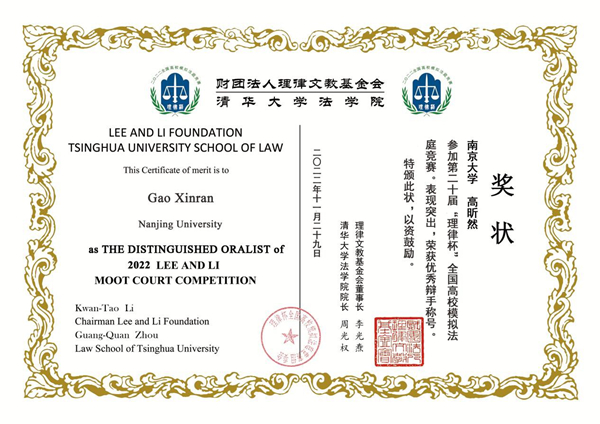 代表队历经初赛、复赛、半决赛、决赛,在40支参赛队伍中脱颖而出,继2004年、2007年之后第三次荣获全国冠军。同时,曲咨丞同学获最佳辩手奖,高昕然同学获优秀辩手奖。“理律杯”全国高校模拟法庭辩论赛是由理律杯模拟法庭竞赛组委会主办、台湾理律文教基金会和台湾理律法律事务所协办的模拟法庭竞赛,比赛每年于清华大学新澳彩开奖