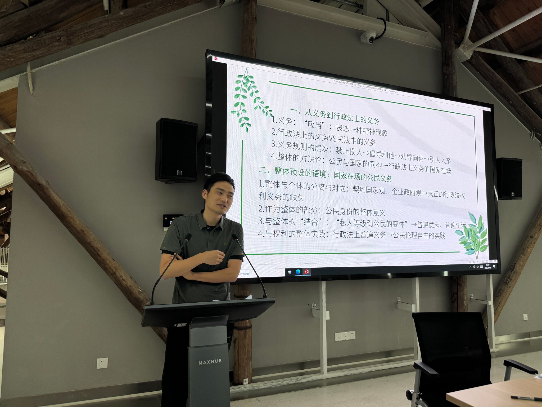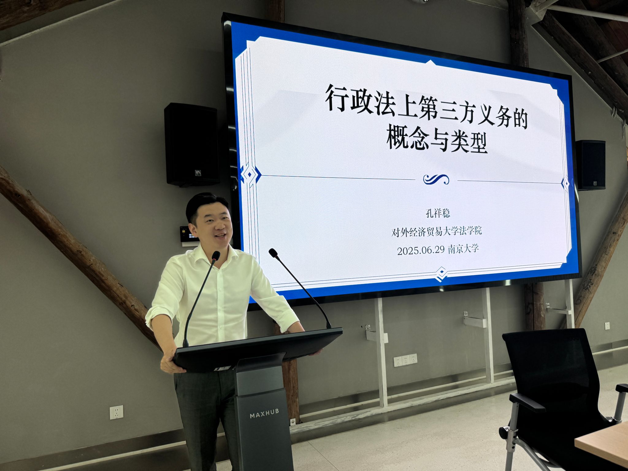 孔祥稳副教授报告了《行政法上第三方义务的概念与类型》。首先,孔祥稳提出,第三方义务是一个描述性概念而非规范意义上的概念,因此他系统剖析了“私人承担的公共治理义务”概念,指出其核心特点包括立法直接设定、公共利益导向、无需行政授权及多元履行条件等,并创新性提出其既区别于传统行政授权、委托,也不同于行政助手或民营化模式。其次,孔祥稳介绍,美国法上对第三方义务的多元分类——从吹哨人、守门人到有能力对于违法行为做出更强和更彻底的干预的主体的三元框架,以及基于私人主体的位置(核心或边缘)、获利情况的细分维度——凸显了制度设计的灵活性与复杂性。最后,孔祥稳进一步围绕第三方义务的正当性基础、私人执法边界、主体能力评估及成本效益平衡等关键问题展开深度思考,为公共治理领域引入私人主体参与提供了全新的理论视角,也进一步拓宽了行政法义务的讨论视野。