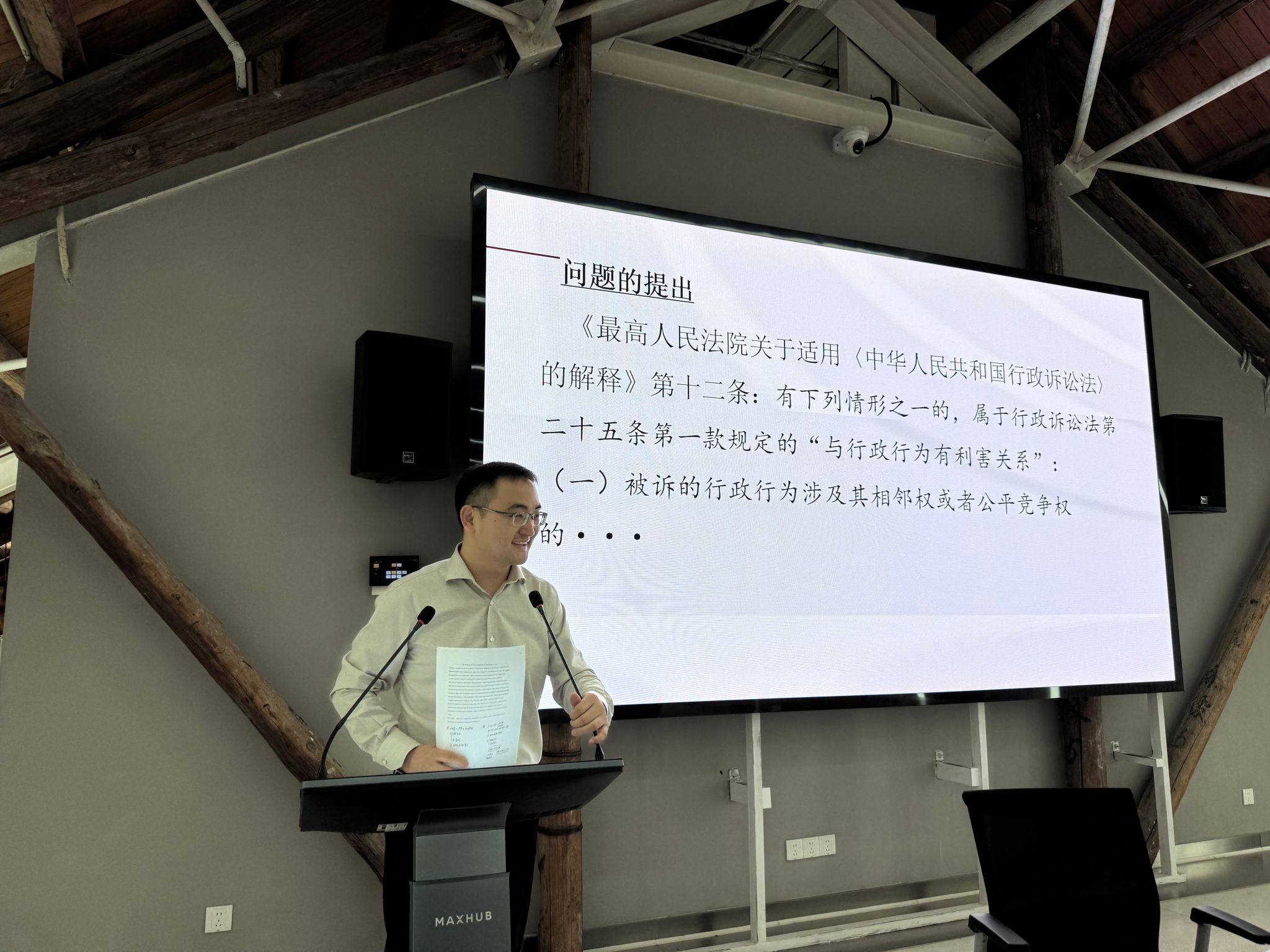 黄宇骁副教授就《行政法上权利观念的三代演进》进行分享报告。黄宇骁指出,行政法上的权利观念十分暧昧。不仅行政法权利的概念相对陌生,行政权利的性质、来源及与依法行政的关系往往模糊不清,而且传统权利观念将公民的权利与自由统计式罗列。因此,黄宇骁独创性地指出,行政法上权利观念经历了三代演进:第一代既得权观念→第二代实体请求权观念→第三代利害调整与行政法律关系。他质疑传统的行政法律关系属于纵向结构,主张行政法上的实质权利义务关系应是公民之间的横向关系,行政机关只是作为仲裁者进行社会利益的横向调整。他进一步介绍了多种利害关系类型,如相互利害关系、共同利害关系、互换利害关系、复合利害关系等有趣现象。总结了第三代权利观念与传统权利观念的区别,强调了其理论创新之处。