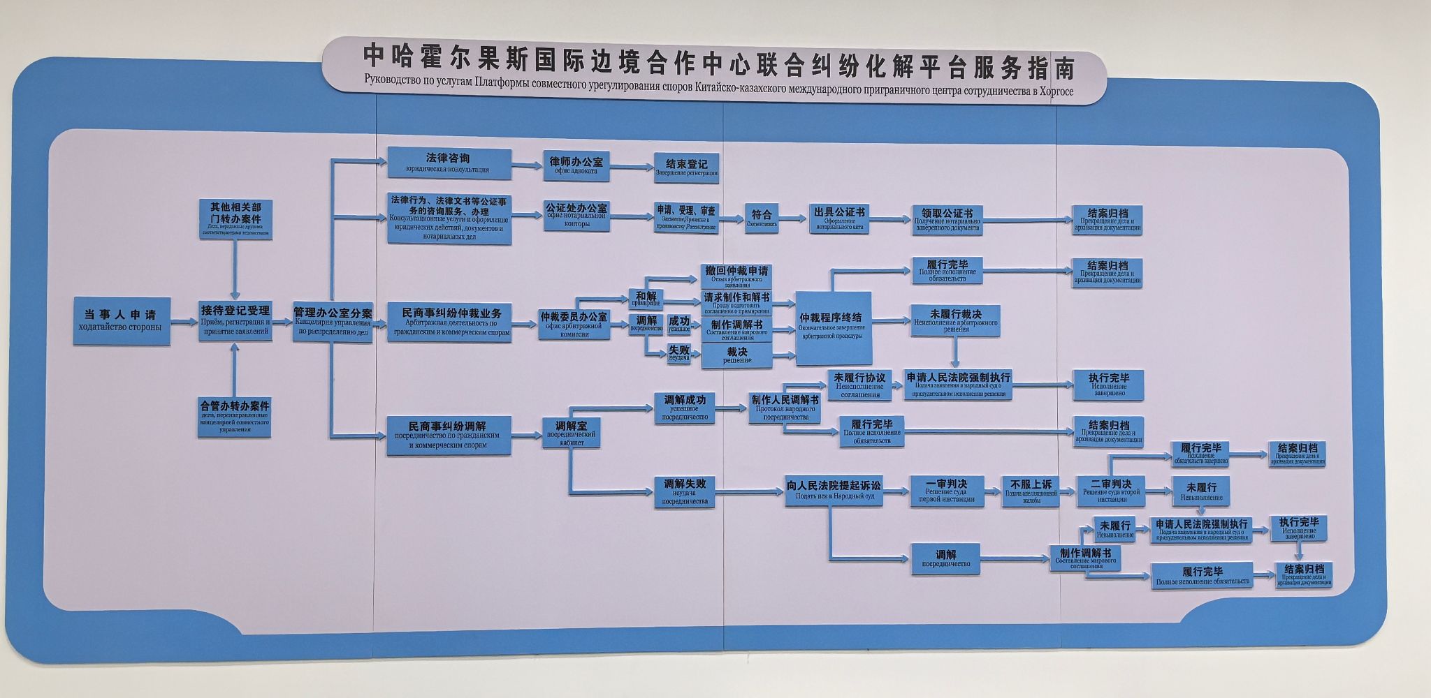 霍尔果斯驿路国际法务区于2024年8月9日正式成立,以我国西北地区的综合性国际法律服务平台和丝绸之路经济带上的涉外法律服务中枢为建设目标。国际法务区总面积1280平方米,立足“涉外法律研究、涉外法律启蒙、涉外法律服务、困难诉求解决”四大职能,采取“政府引导+孵化器招商”方式,引进国际仲裁机构、涉外律所、投资贸易中介机构、涉外会计师事务所、税务师事务所、涉外广告传媒等主体,打造涉外法律服务产业集聚的高地,让优质的涉外法律服务成为霍尔果斯营商环境最亮眼的名片,辐射带动更多实体企业来霍尔果斯投资兴业。
