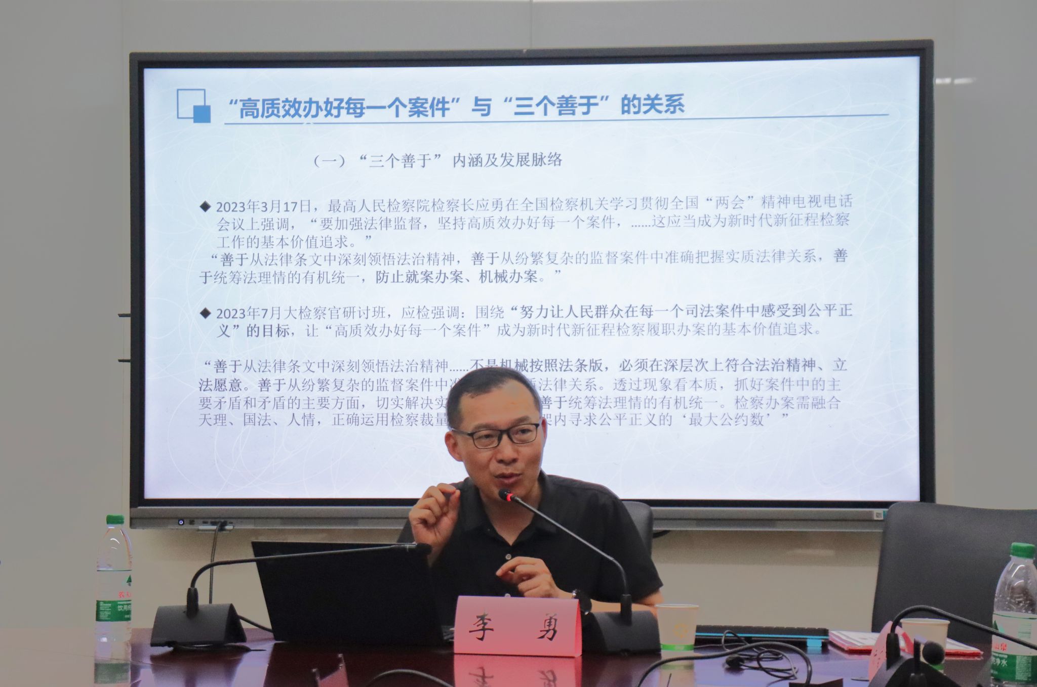 李勇主任认为,要实现高质效办案,必须坚持“三个善于”,要善于从纷繁复杂的法律事实中准确把握实质法律关系,善于从具体法律条文中深刻领悟法治精神,善于在法理情的有机统一中实现公平正义。他提出解决机械司法的关键在于妥善处理专业判断与朴素正义观、客观与主观、形式与实质、打击与保护、以人民为中心与法益保护这五对关系,并注重阶层论、三段论、后果考察和体系解释这四种基本审查方法的运用。