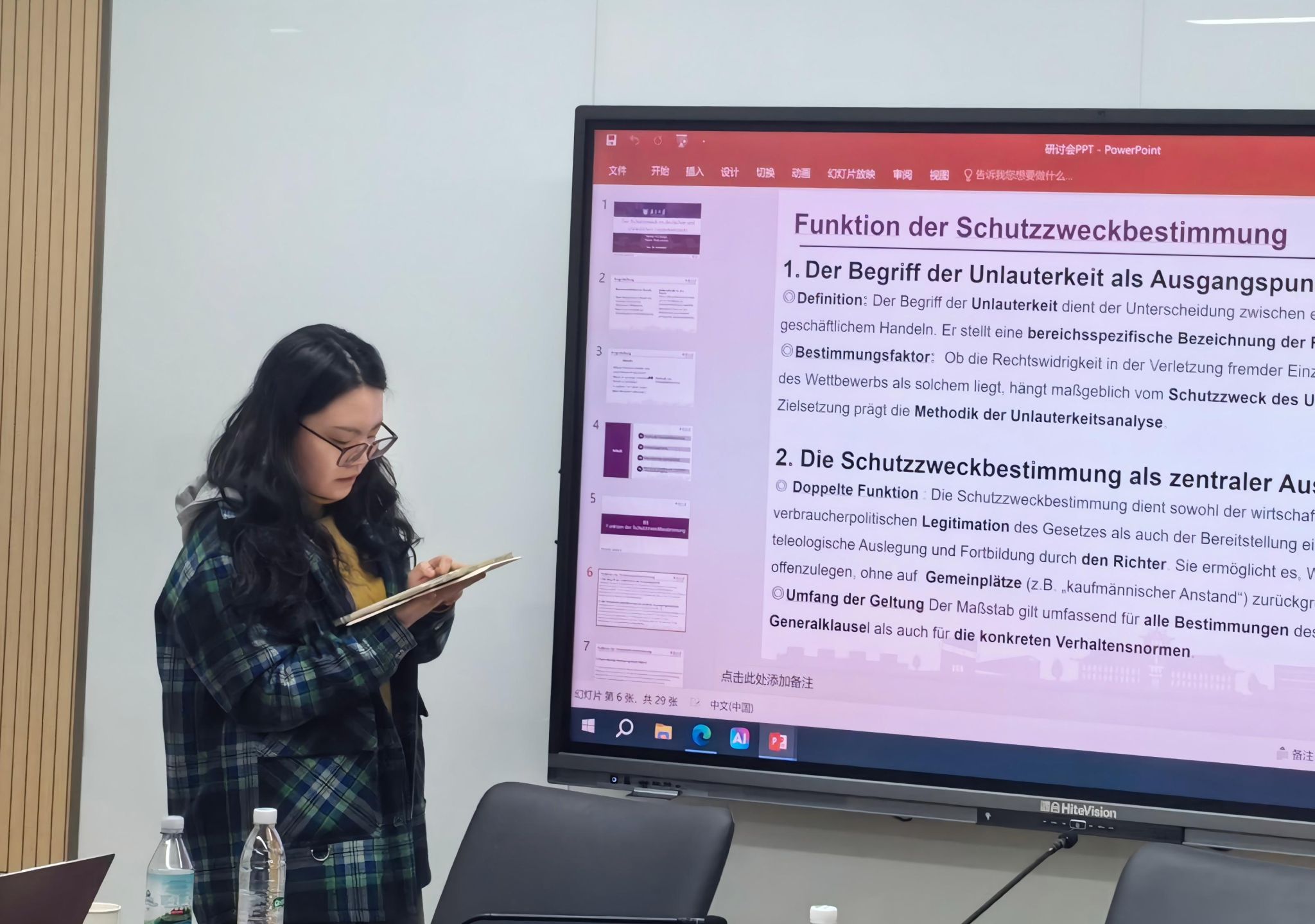 第二位报告人是徐湘宜同学,她的报告题目是《德国与中国反不正当竞争法中的保护目的》。徐湘怡指出,两国法律虽在规范层面均确立了保护竞争者、消费者与竞争秩序的三重目标,但在司法实践中呈现出深刻差异:德国法通过动态的利益权衡方法,在具体个案中对多重保护目标进行综合考量;而中国司法实践仍在一定程度上受侵权法思维路径依赖的影响,倾向于从经营者利益受损角度直接推定行为不正当性。